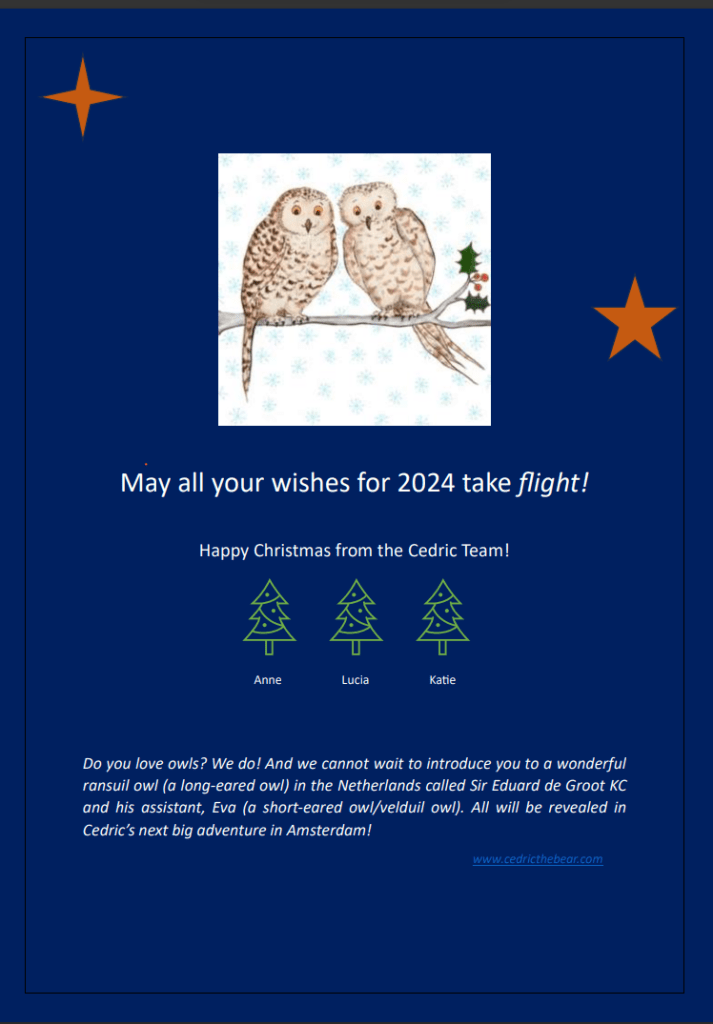 Are you looking for a new story to read to children, a tale of magic, owls, a mysterious dolls’ house, with a touch of spookiness and a race for justice? Look no further than our book Cedric in Amsterdam with wonderful illustrations by Anne Bowes.